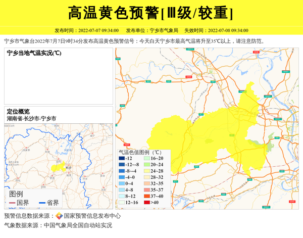 宁乡市气象台2022年7月7日9时34分发布高温黄色预警信号:今天白天宁乡市最高气温将升至35℃以上,请注意防范。 信息来源:国家预警信息发布中心; 发布单位:宁乡市气象局。