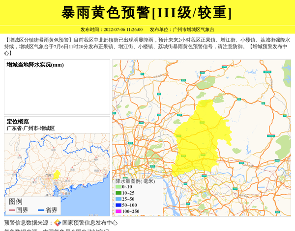 【增城区分镇街暴雨黄色预警】目前我区中北部镇街已出现明显降雨,预计未来2小时我区正果镇、增江街、小楼镇、荔城街强降水持续,增城区气象台于7月6日11时20分发布正果镇、增江街、小楼镇、荔城街暴雨黄色预警信号,请注意防御。【增城预警发布中心】 信息来源:国家预警信息发布中心; 发布单位:广州市增城区气象台。