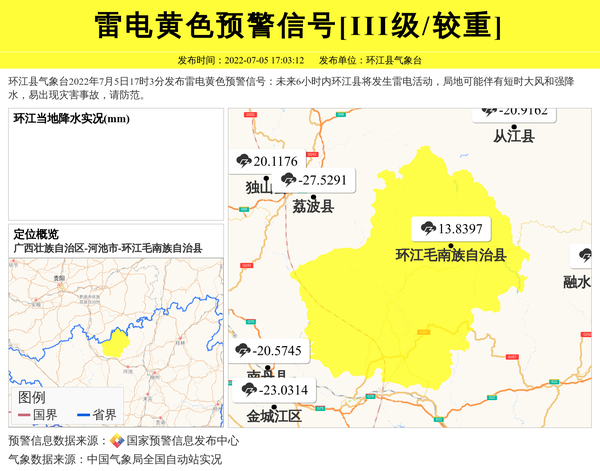 环江县气象台2022年7月5日17时3分发布雷电黄色预警信号:未来6小时内环江县将发生雷电活动,局地可能伴有短时大风和强降水,易出现灾害事故,请防范。 信息来源:国家预警信息发布中心; 发布单位:环江县气象台。