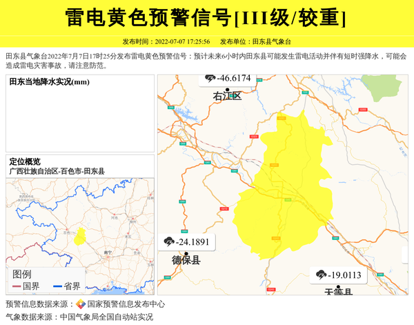 田东县气象台2022年7月7日17时25分发布雷电黄色预警信号:预计未来6小时内田东县可能发生雷电活动并伴有短时强降水,可能会造成雷电灾害事故,请注意防范。 信息来源:国家预警信息发布中心; 发布单位:田东县气象台。