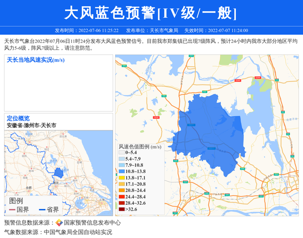 天长市气象台2022年07月06日11时24分发布大风蓝色预警信号。目前我市郑集镇已出现7级阵风,预计24小时内我市大部分地区平均风力5-6级,阵风7级以上,请注意防范。 信息来源:国家预警信息发布中心; 发布单位:天长市气象局。