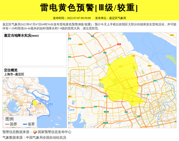 嘉定区气象局2022年07月07日09时50分发布雷电黄色预警[Ⅲ级/较重]:预计今天上半夜以前我区大部分街镇将发生雷电活动,并可能伴有一小时雨强20-40毫米的短时强降水和7-9级的雷雨大风,请注意防范。 信息来源:国家预警信息发布中心; 发布单位:嘉定区气象局。