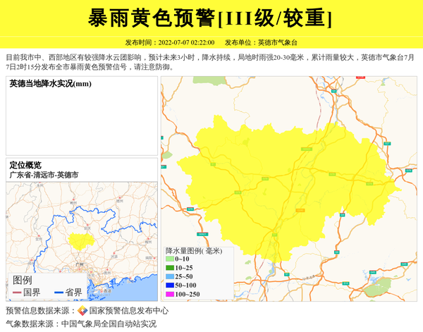 目前我市中、西部地区有较强降水云团影响,预计未来3小时,降水持续,局地时雨强20-30毫米,累计雨量较大,英德市气象台7月7日2时15分发布全市暴雨黄色预警信号,请注意防御。 信息来源:国家预警信息发布中心; 发布单位:英德市气象台。