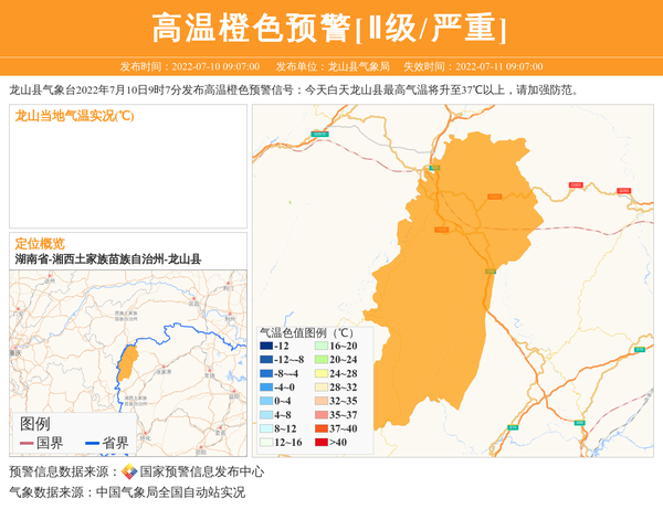龙山县气象台2022年7月10日9时7分发布高温橙色预警信号:今天白天龙山县最高气温将升至37℃以上,请加强防范。 信息来源:国家预警信息发布中心; 发布单位:龙山县气象局。