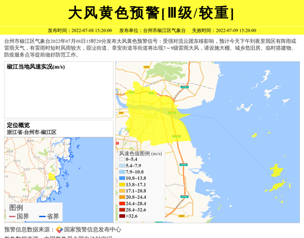 台州市椒江区气象台2022年07月08日15时20分发布大风黄色预警信号:受强对流云团东移影响,预计今天下午到夜里我区有阵雨或雷雨天气,有雷雨时短时风雨较大,葭沚街道、章安街道等街道将出现7~9级雷雨大风,请设施大棚、城乡危旧房、临时搭建物、防疫服务点等提前做好防范工作。 信息来源:国家预警信息发布中心; 发布单位:台州市椒江区气象台。