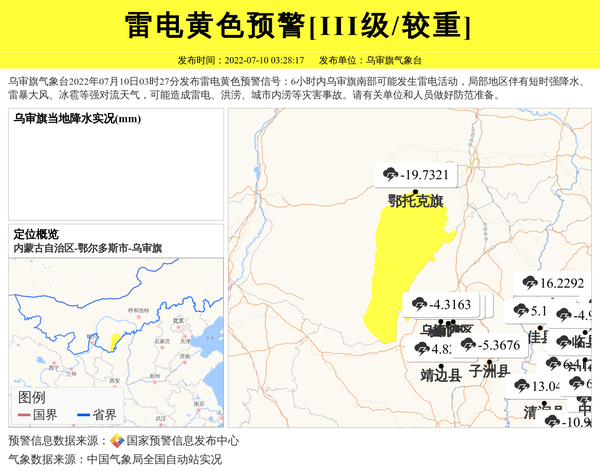 乌审旗气象台2022年07月10日03时27分发布雷电黄色预警信号:6小时内乌审旗南部可能发生雷电活动,局部地区伴有短时强降水、雷暴大风、冰雹等强对流天气,可能造成雷电、洪涝、城市内涝等灾害事故。请有关单位和人员做好防范准备。 信息来源:国家预警信息发布中心; 发布单位:乌审旗气象台。