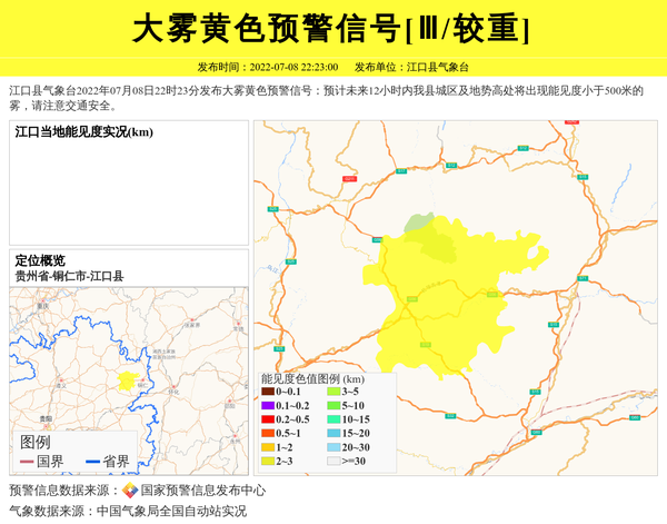 江口县气象台2022年07月08日22时23分发布大雾黄色预警信号:预计未来12小时内我县城区及地势高处将出现能见度小于500米的雾,请注意交通安全。 信息来源:国家预警信息发布中心; 发布单位:江口县气象台。
