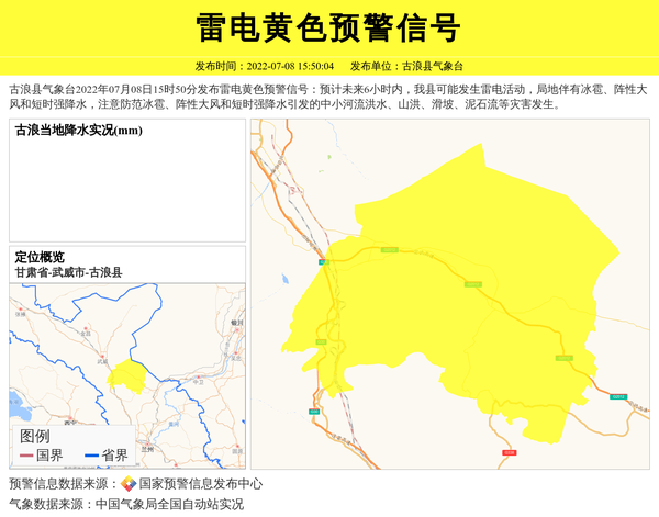 古浪县气象台2022年07月08日15时50分发布雷电黄色预警信号:预计未来6小时内,我县可能发生雷电活动,局地伴有冰雹、阵性大风和短时强降水,注意防范冰雹、阵性大风和短时强降水引发的中小河流洪水、山洪、滑坡、泥石流等灾害发生。 信息来源:国家预警信息发布中心; 发布单位:古浪县气象台。