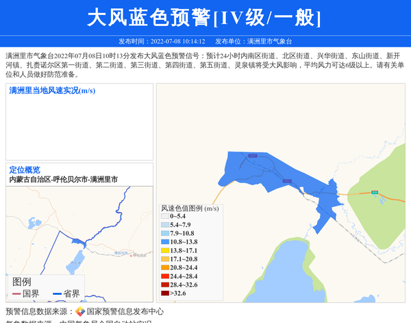 满洲里市气象台2022年07月08日10时13分发布大风蓝色预警信号:预计24小时内南区街道、北区街道、兴华街道、东山街道、新开河镇、扎赉诺尔区第一街道、第二街道、第三街道、第四街道、第五街道、灵泉镇将受大风影响,平均风力可达6级以上。请有关单位和人员做好防范准备。 信息来源:国家预警信息发布中心; 发布单位:满洲里市气象台。