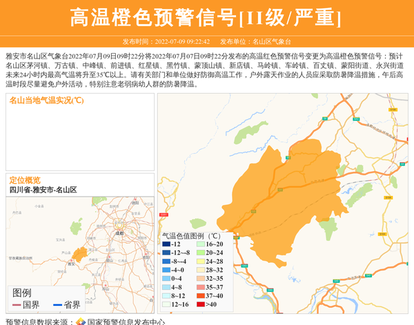 雅安市名山区气象台2022年07月09日09时22分将2022年07月07日09时22分发布的高温红色预警信号变更为高温橙色预警信号:预计名山区茅河镇、万古镇、中峰镇、前进镇、红星镇、黑竹镇、蒙顶山镇、新店镇、马岭镇、车岭镇、百丈镇、蒙阳街道、永兴街道未来24小时内最高气温将升至35℃以上。请有关部门和单位做好防御高温工作,户外露天作业的人员应采取防暑降温措施,午后高温时段尽量避免户外活动,特别注意老弱病幼人群的防暑降温。 信息来源:国家预警信息发布中心; 发布单位:名山区气象台。