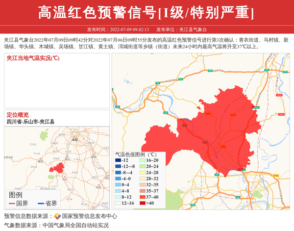 夹江县气象台2022年07月09日09时42分对2022年07月06日09时55分发布的高温红色预警信号进行第3次确认:青衣街道、马村镇、新场镇、华头镇、木城镇、吴场镇、甘江镇、黄土镇、漹城街道等乡镇(街道)未来24小时内最高气温将升至37℃以上。 信息来源:国家预警信息发布中心; 发布单位:夹江县气象台。