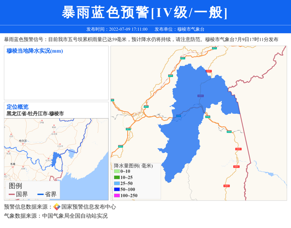 暴雨蓝色预警信号:目前我市五号坝累积雨量已达59毫米,预计降水仍将持续,请注意防范。穆棱市气象台7月9日17时11分发布 信息来源:国家预警信息发布中心; 发布单位:穆棱市气象台。