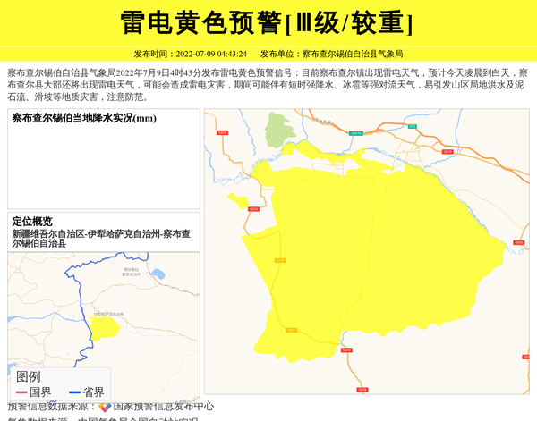 察布查尔锡伯自治县气象局2022年7月9日4时43分发布雷电黄色预警信号:目前察布查尔镇出现雷电天气,预计今天凌晨到白天,察布查尔县大部还将出现雷电天气,可能会造成雷电灾害,期间可能伴有短时强降水、冰雹等强对流天气,易引发山区局地洪水及泥石流、滑坡等地质灾害,注意防范。 信息来源:国家预警信息发布中心; 发布单位:察布查尔锡伯自治县气象局。