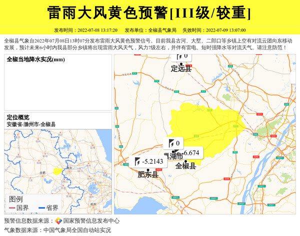 全椒县气象台2022年07月08日13时07分发布雷雨大风黄色预警信号。目前我县古河、大墅、二郎口等乡镇上空有对流云团向东移动发展,预计未来6小时内我县部分乡镇将出现雷雨大风天气,风力7级左右,并伴有雷电、短时强降水等对流天气。请注意防范! 信息来源:国家预警信息发布中心; 发布单位:全椒县气象局。