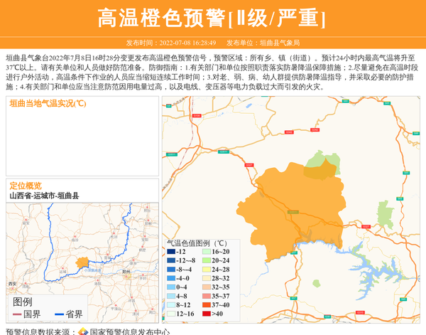 垣曲县气象台2022年7月8日16时28分变更发布高温橙色预警信号,预警区域:所有乡、镇(街道)。预计24小时内最高气温将升至37℃以上。请有关单位和人员做好防范准备。防御指南:1.有关部门和单位按照职责落实防暑降温保障措施;2.尽量避免在高温时段进行户外活动,高温条件下作业的人员应当缩短连续工作时间;3.对老、弱、病、幼人群提供防暑降温指导,并采取必要的防护措施;4.有关部门和单位应当注意防范因用电量过高,以及电线、变压器等电力负载过大而引发的火灾。 信息来源:国家预警信息发布中心; 发布单位:垣曲县气象局。