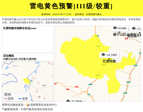 扎赉特旗气象台2022年07月08日17时10分发布雷电黄色预警信号:预计未来6小时内,我旗大部地区有分散性雷电活动,并伴有雷雨大风、冰雹和短时强降水等强对流天气,请有关单位和人员做好防范。 信息来源:国家预警信息发布中心; 发布单位:扎赉特旗气象台。