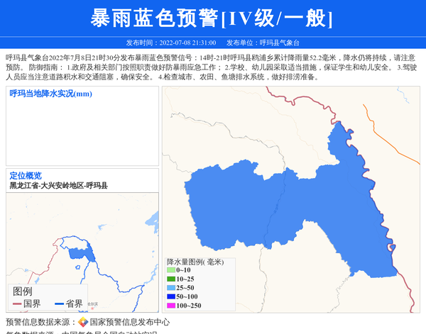 呼玛县气象台2022年7月8日21时30分发布暴雨蓝色预警信号:14时-21时呼玛县鸥浦乡累计降雨量52.2毫米,降水仍将持续,请注意预防。 防御指南: 1.政府及相关部门按照职责做好防暴雨应急工作; 2.学校、幼儿园采取适当措施,保证学生和幼儿安全。 3.驾驶人员应当注意道路积水和交通阻塞,确保安全。 4.检查城市、农田、鱼塘排水系统,做好排涝准备。 信息来源:国家预警信息发布中心; 发布单位:呼玛县气象台。