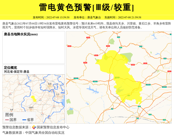 唐县气象台2022年07月08日15时54分发布雷电黄色预警信号:预计未来6小时内,我县倒马关乡、川里镇、黄石口乡、羊角乡有雷阵雨天气,雷雨时个别乡镇伴有短时强降水、短时大风、冰雹等强对流天气,请有关单位和人员做好防范准备。 信息来源:国家预警信息发布中心; 发布单位:唐县气象台。
