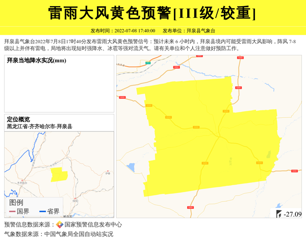 拜泉县气象台2022年7月8日17时40分发布雷雨大风黄色预警信号:预计未来 6 小时内,拜泉县境内可能受雷雨大风影响,阵风 7-8 级以上并伴有雷电,局地将出现短时强降水、冰雹等强对流天气。请有关单位和个人注意做好预防工作。 信息来源:国家预警信息发布中心; 发布单位:拜泉县气象台。