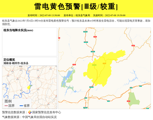 桂东县气象台2022年7月8日13时50分发布雷电黄色预警信号:预计桂东县未来6小时将发生雷电活动,可能出现雷电灾害事故,请加强防范。 信息来源:国家预警信息发布中心; 发布单位:桂东县气象局。