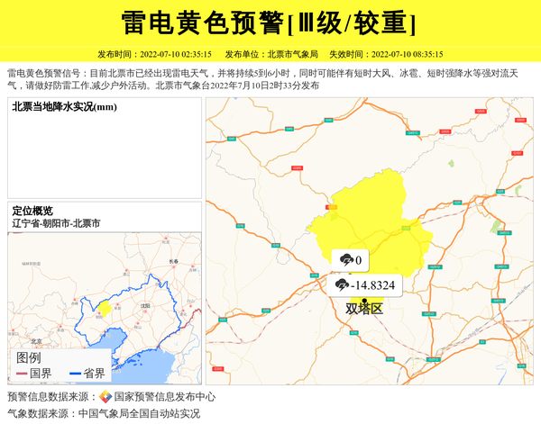 雷电黄色预警信号:目前北票市已经出现雷电天气,并将持续5到6小时,同时可能伴有短时大风、冰雹、短时强降水等强对流天气,请做好防雷工作,减少户外活动。北票市气象台2022年7月10日2时33分发布 信息来源:国家预警信息发布中心; 发布单位:北票市气象局。