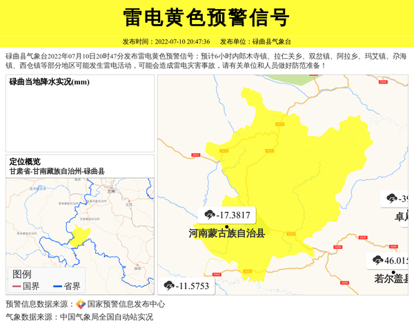 碌曲县气象台2022年07月10日20时47分发布雷电黄色预警信号:预计6小时内郎木寺镇、拉仁关乡、双岔镇、阿拉乡、玛艾镇、尕海镇、西仓镇等部分地区可能发生雷电活动,可能会造成雷电灾害事故,请有关单位和人员做好防范准备! 信息来源:国家预警信息发布中心; 发布单位:碌曲县气象台。