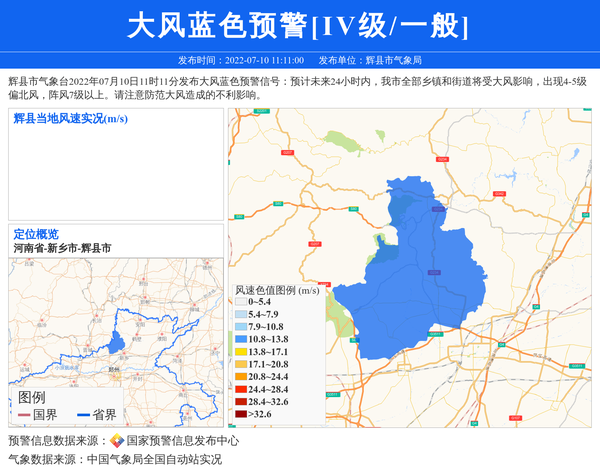 辉县市气象台2022年07月10日11时11分发布大风蓝色预警信号:预计未来24小时内,我市全部乡镇和街道将受大风影响,出现4-5级偏北风,阵风7级以上。请注意防范大风造成的不利影响。 信息来源:国家预警信息发布中心; 发布单位:辉县市气象局。