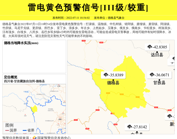 德格县气象台发布雷电黄色预警信号[III级/较重]