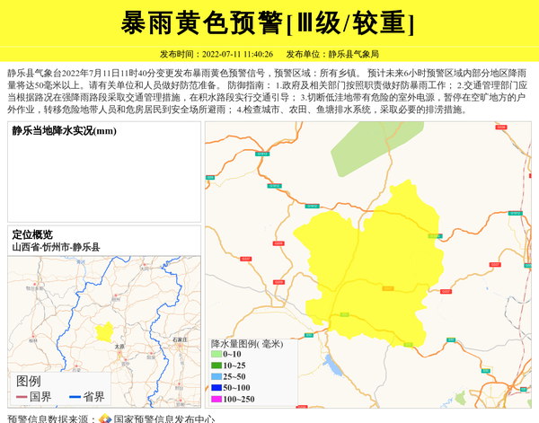 静乐县气象局发布暴雨黄色预警[Ⅲ级/较重]