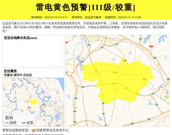 定远县气象台2022年07月10日15时11分发布雷电黄色预警信号。目前我县境内严桥、三和集、定城等乡镇有对流回波向东北方向移动发展,预计未来6小时内桑涧、拂晓一带乡镇可能发生雷电活动,可能会造成雷电灾害事故,并可能伴有6-7级阵风。请注意防范! 信息来源:国家预警信息发布中心; 发布单位:定远县气象局。