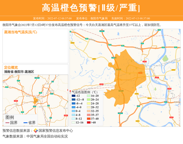 衡阳市气象台2022年7月12日8时37分发布高温橙色预警信号:今天白天蒸湘区最高气温将升至37℃以上,请加强防范。 信息来源:国家预警信息发布中心; 发布单位:衡阳市气象局。