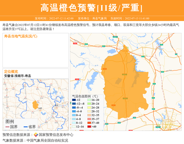 寿县气象台2022年07月12日11时41分继续发布高温橙色预警信号。预计我县寿春、堰口、双庙和三觉等大部分乡镇24小时内最高气温将升至37℃以上。请注意防暑降温! 信息来源:国家预警信息发布中心; 发布单位:寿县气象局。