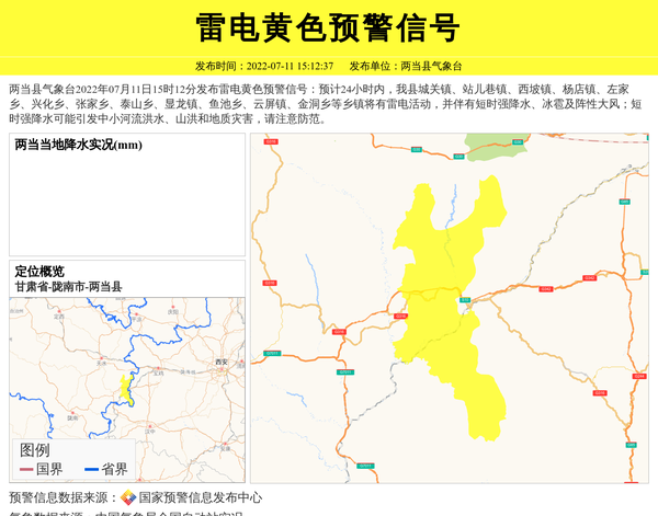 两当县气象台2022年07月11日15时12分发布雷电黄色预警信号:预计24小时内,我县城关镇、站儿巷镇、西坡镇、杨店镇、左家乡、兴化乡、张家乡、泰山乡、显龙镇、鱼池乡、云屏镇、金洞乡等乡镇将有雷电活动,并伴有短时强降水、冰雹及阵性大风;短时强降水可能引发中小河流洪水、山洪和地质灾害,请注意防范。 信息来源:国家预警信息发布中心; 发布单位:两当县气象台。