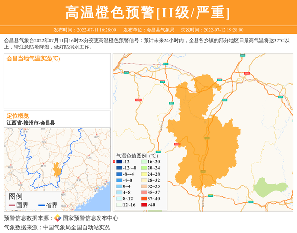 会昌县气象台2022年07月11日16时28分变更高温橙色预警信号:预计未来24小时内,全县各乡镇的部分地区日最高气温将达37°C以上,请注意防暑降温,做好防溺水工作。 信息来源:国家预警信息发布中心; 发布单位:会昌县气象局。