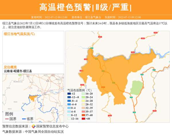 绥江县气象台2022年7月12日9时12分继续发布高温橙色预警信号:预计未来24小时,我县各乡镇低海拔地区日最高气温将达37℃以上,请注意做好防暑降温工作。 信息来源:国家预警信息发布中心; 发布单位:绥江县气象台。