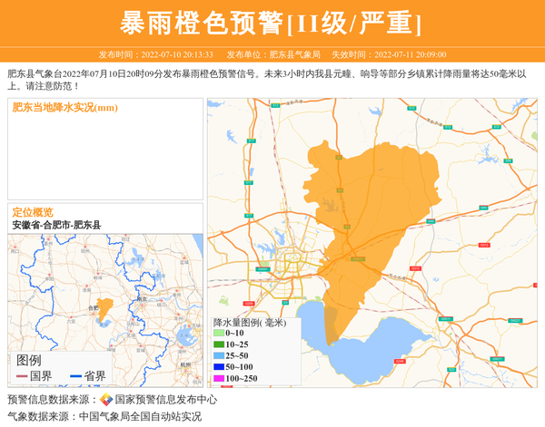 肥东县气象台2022年07月10日20时09分发布暴雨橙色预警信号。未来3小时内我县元疃、响导等部分乡镇累计降雨量将达50毫米以上。请注意防范! 信息来源:国家预警信息发布中心; 发布单位:肥东县气象局。