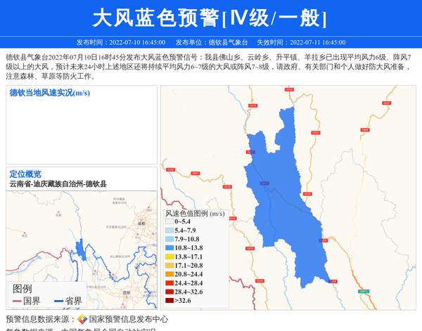 德钦县气象台2022年07月10日16时45分发布大风蓝色预警信号:我县佛山乡、云岭乡、升平镇、羊拉乡已出现平均风力6级、阵风7级以上的大风,预计未来24小时上述地区还将持续平均风力6~7级的大风或阵风7~8级,请政府、有关部门和个人做好防大风准备,注意森林、草原等防火工作。 信息来源:国家预警信息发布中心; 发布单位:德钦县气象台。