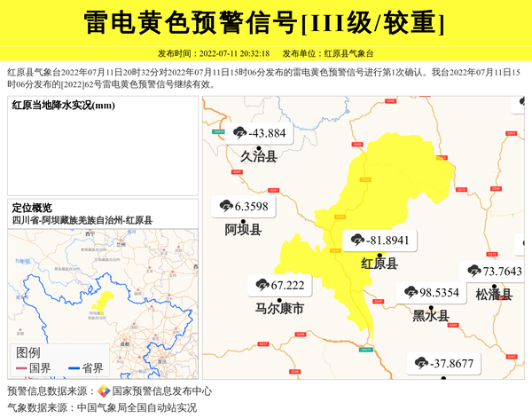 红原县气象台2022年07月11日20时32分对2022年07月11日15时06分发布的雷电黄色预警信号进行第1次确认。我台2022年07月11日15时06分发布的[2022]62号雷电黄色预警信号继续有效。 信息来源:国家预警信息发布中心; 发布单位:红原县气象台。