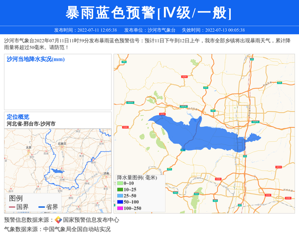 沙河市气象台2022年07月11日11时59分发布暴雨蓝色预警信号:预计11日下午到12日上午,我市全部乡镇将出现暴雨天气,累计降雨量将超过50毫米。请防范! 信息来源:国家预警信息发布中心; 发布单位:沙河市气象台。