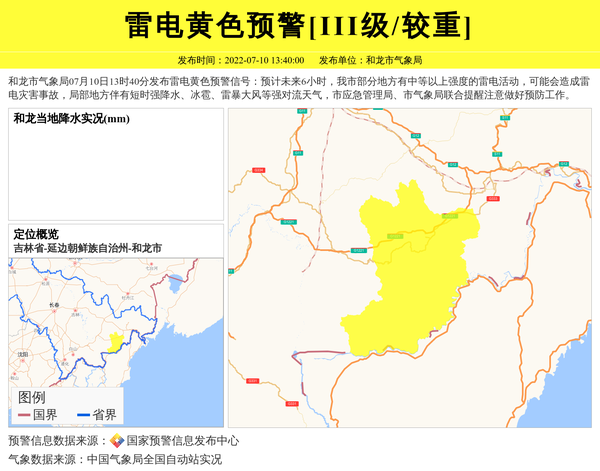 和龙市气象局发布雷电黄色预警[III级/较重]