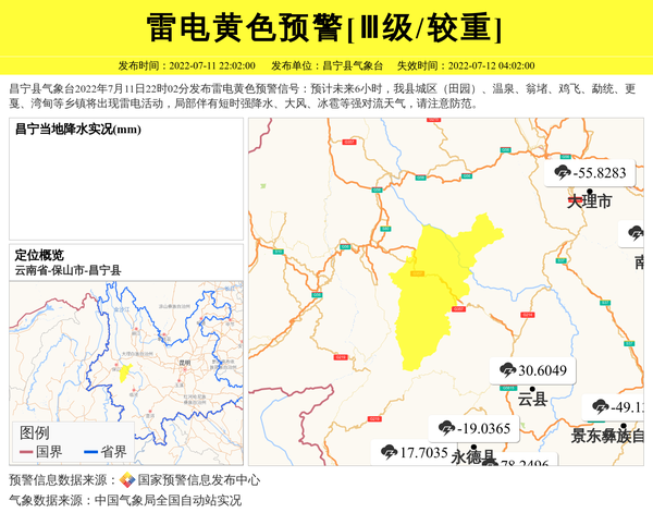 昌宁县气象台2022年7月11日22时02分发布雷电黄色预警信号:预计未来6小时,我县城区(田园)、温泉、翁堵、鸡飞、勐统、更戛、湾甸等乡镇将出现雷电活动,局部伴有短时强降水、大风、冰雹等强对流天气,请注意防范。 信息来源:国家预警信息发布中心; 发布单位:昌宁县气象台。