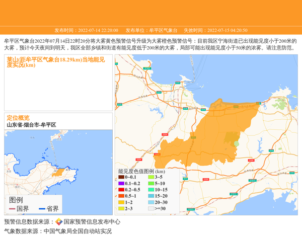 牟平区气象台2022年07月14日22时20分将大雾黄色预警信号升级为大雾橙色预警信号:目前我区宁海街道已出现能见度小于200米的大雾,预计今天夜间到明天,我区全部乡镇和街道有能见度低于200米的大雾,局部可能出现能见度小于50米的浓雾。请注意防范。 信息来源:国家预警信息发布中心; 发布单位:牟平区气象台。