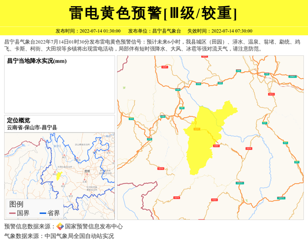 昌宁县气象台2022年7月14日01时30分发布雷电黄色预警信号:预计未来6小时,我县城区(田园)、漭水、温泉、翁堵、勐统、鸡飞、卡斯、柯街、大田坝等乡镇将出现雷电活动,局部伴有短时强降水、大风、冰雹等强对流天气,请注意防范。 信息来源:国家预警信息发布中心; 发布单位:昌宁县气象台。