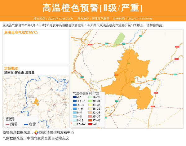 辰溪县气象台2022年7月13日8时30分发布高温橙色预警信号:今天白天辰溪县最高气温将升至37℃以上,请加强防范。 信息来源:国家预警信息发布中心; 发布单位:辰溪县气象局。