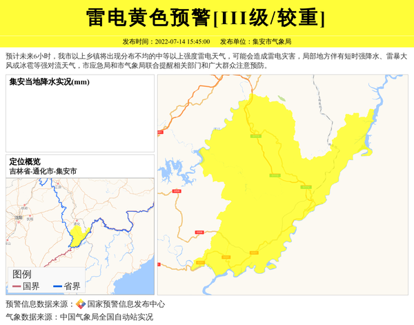 预计未来6小时,我市以上乡镇将出现分布不均的中等以上强度雷电天气,可能会造成雷电灾害,局部地方伴有短时强降水、雷暴大风或冰雹等强对流天气,市应急局和市气象局联合提醒相关部门和广大群众注意预防。 信息来源:国家预警信息发布中心; 发布单位:集安市气象局。