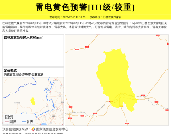 巴林左旗气象台2022年07月13日11时52分继续发布2022年07月13日05时46分发布的雷电黄色预警信号:6小时内巴林左旗大部地区可能雷电活动,局部地区伴有短时强降水、雷暴大风、冰雹等强对流天气,可能造成雷电、洪涝、城市内涝等灾害事故。请有关单位和人员做好防范准备。 信息来源:国家预警信息发布中心; 发布单位:巴林左旗气象台。