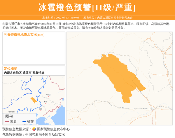 内蒙古通辽市扎鲁特旗气象台2022年07月13日14时48分发布冰雹橙色预警信号:6小时内乌额格其苏木、嘎亥图镇、乌额格其牧场、前德门苏木、黄花山镇可能出现冰雹天气,并可能造成雹灾。请有关单位和人员做好防范准备。 信息来源:国家预警信息发布中心; 发布单位:内蒙古通辽市扎鲁特旗气象台。