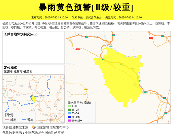 长武县气象台2022年07月12日19时15分继续发布暴雨黄色预警信号:预计下述地区未来6小时内降雨量将达50毫米以上:巨家镇、枣园镇、亭口镇、丁家镇、昭仁街道、相公镇、彭公镇、洪家镇,请注意防范。 信息来源:国家预警信息发布中心; 发布单位:长武县气象台。