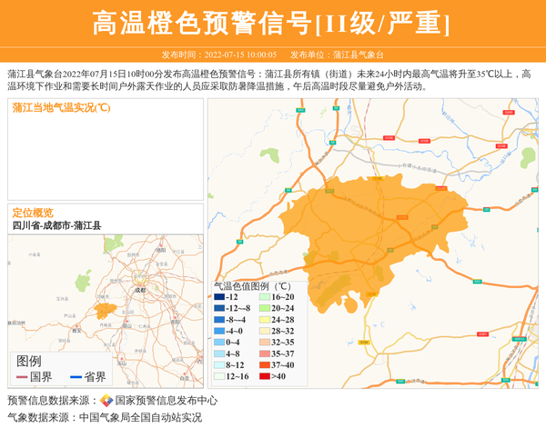蒲江县气象台2022年07月15日10时00分发布高温橙色预警信号:蒲江县所有镇(街道)未来24小时内最高气温将升至35℃以上,高温环境下作业和需要长时间户外露天作业的人员应采取防暑降温措施,午后高温时段尽量避免户外活动。 信息来源:国家预警信息发布中心; 发布单位:蒲江县气象台。