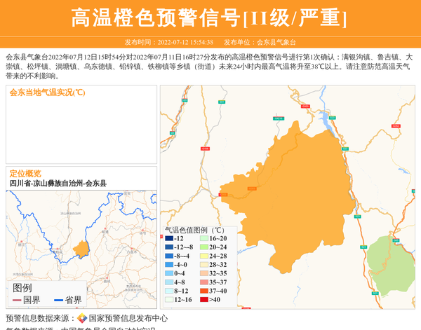 会东县气象台2022年07月12日15时54分对2022年07月11日16时27分发布的高温橙色预警信号进行第1次确认:满银沟镇、鲁吉镇、大崇镇、松坪镇、淌塘镇、乌东德镇、铅锌镇、铁柳镇等乡镇(街道)未来24小时内最高气温将升至38℃以上。请注意防范高温天气带来的不利影响。 信息来源:国家预警信息发布中心; 发布单位:会东县气象台。